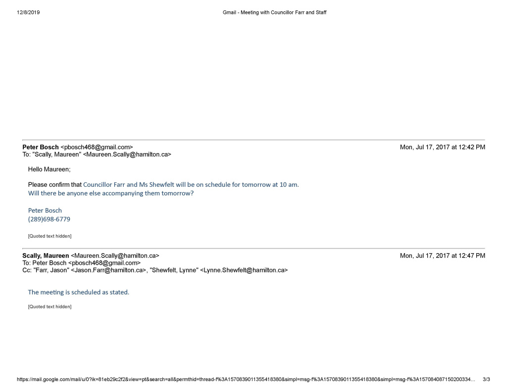 Wednesday July 12, 2017 – Shewfelt hadn’t called by the next morning, so I stopped into City Hall. My notes for July 12, 2017 read as follows: