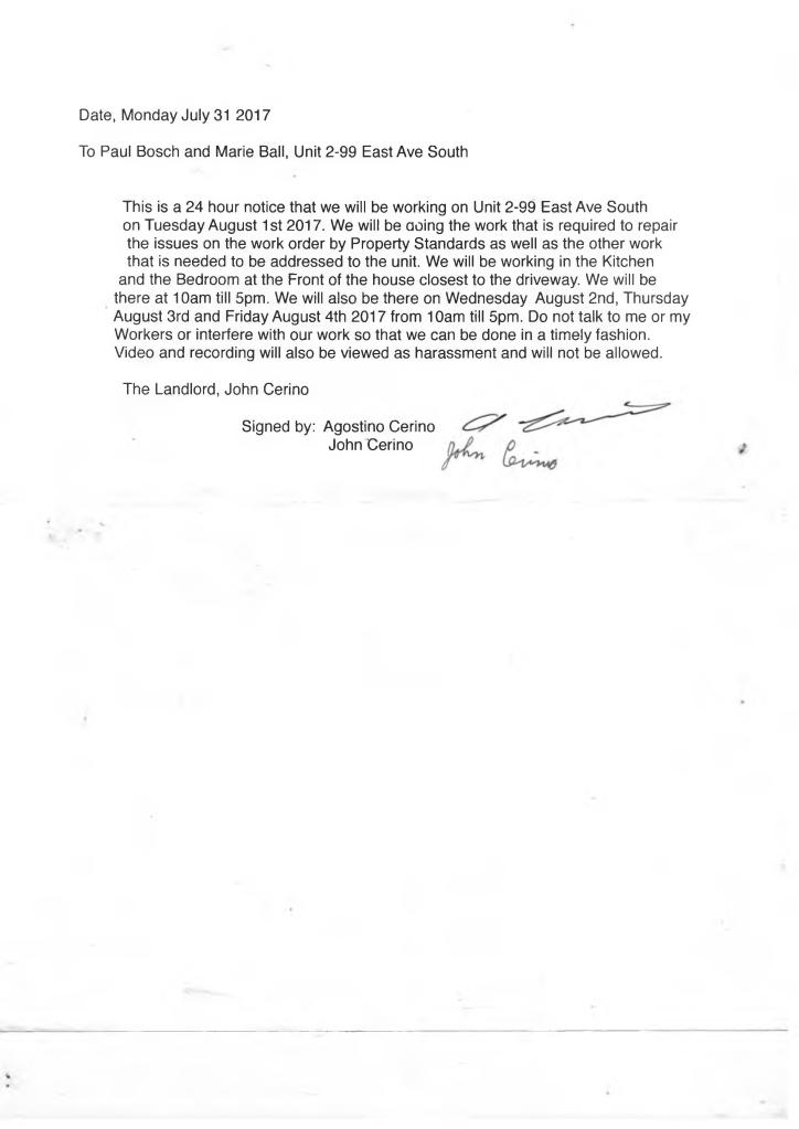 Monday July 31, 2017 – In the morning my roommate found a Notice of Entry that had been delivered by sliding it under our door sometime during the night (Doc 150).