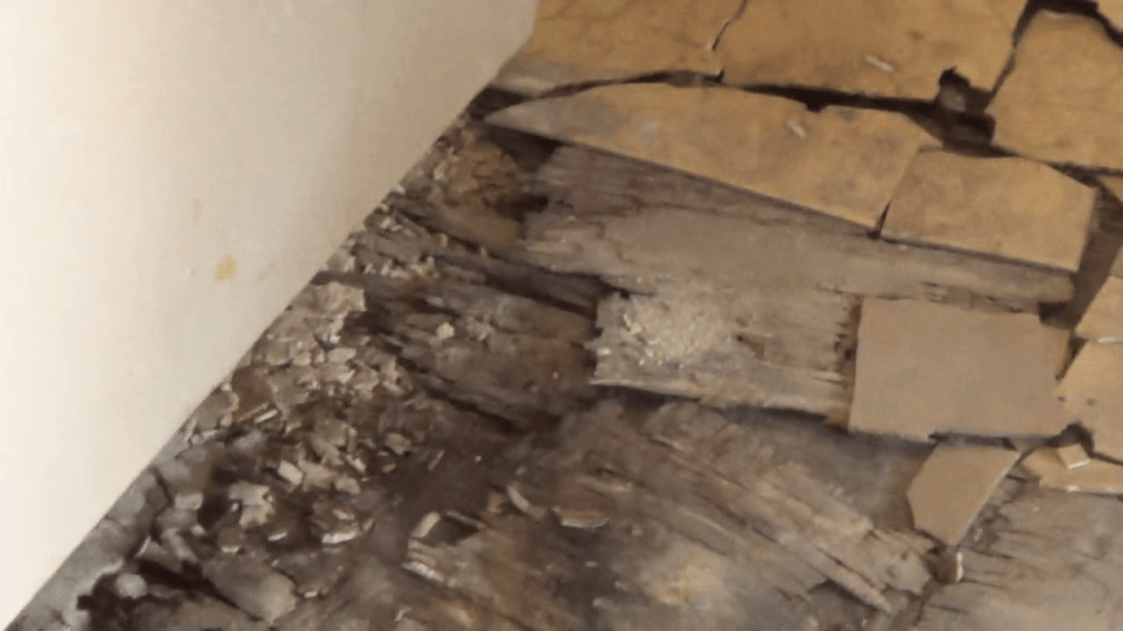 48:24-53:00 – John and Agostino re-enter the unit and cut the linoleum, roll it back out of the way, and begin repairing the rotten wood underneath. John then leaves the unit.