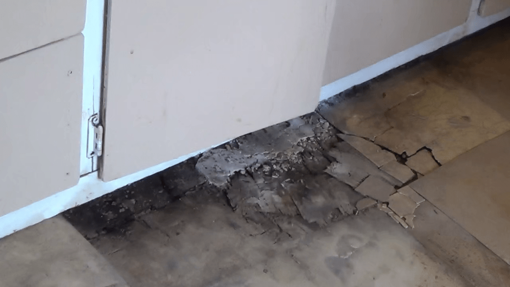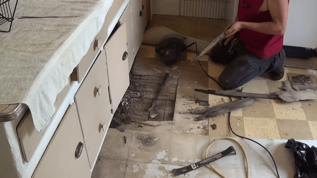 The kitchen floor was repaired in under three hours, not the seven days John had claimed the job would take on February 1, 2017. The screenshots below (Fig 104, Fig 105 and Fig 106) show the rotten wood in the floor. They are screenshots from Vid 21.