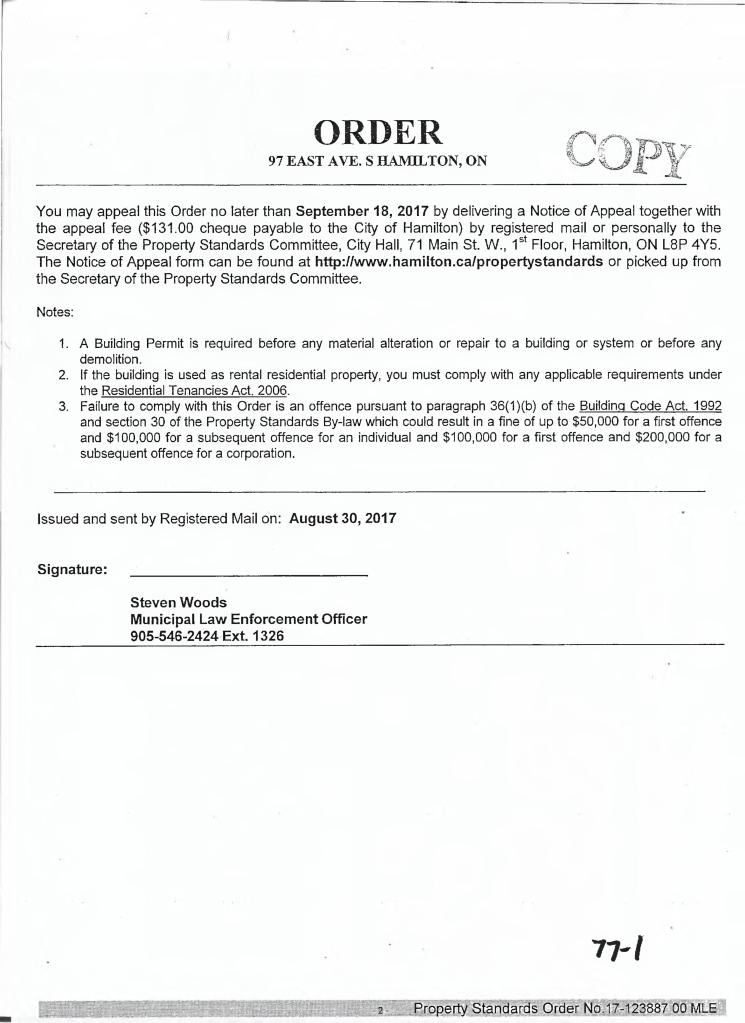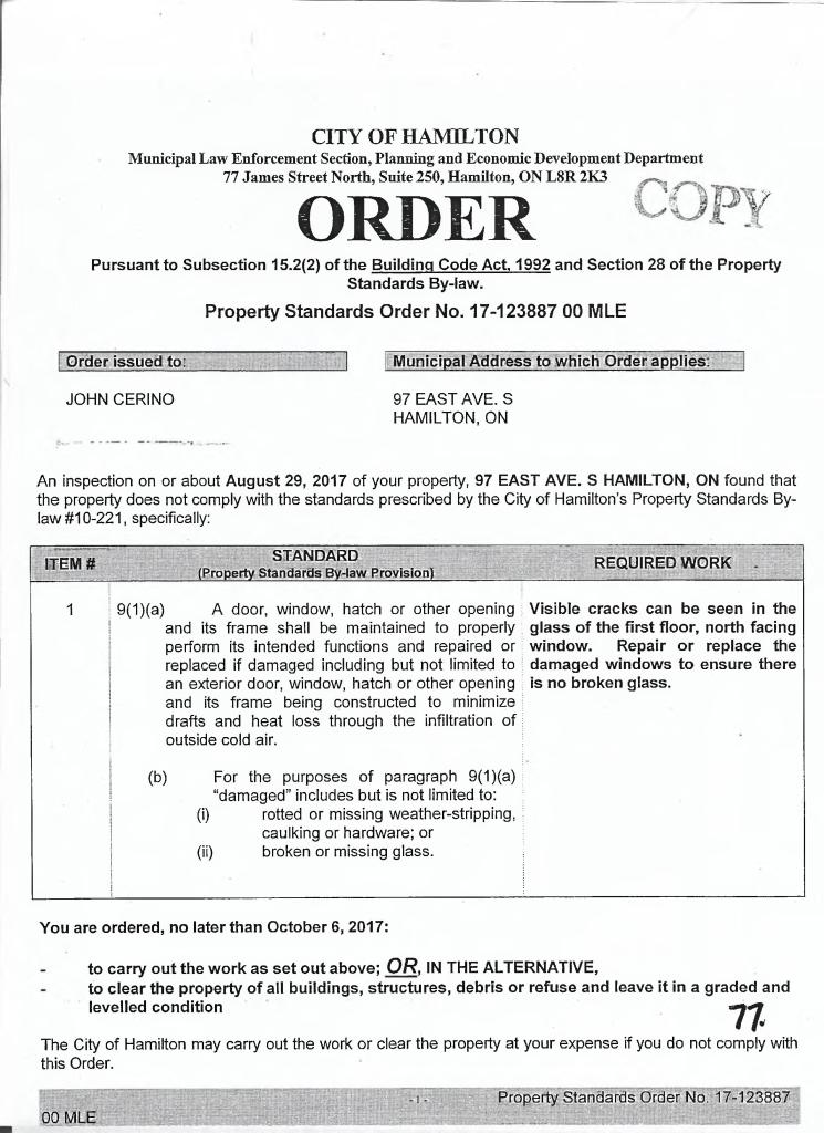 This would be John’s sixth compliance order for the year for the property from Property Standards.