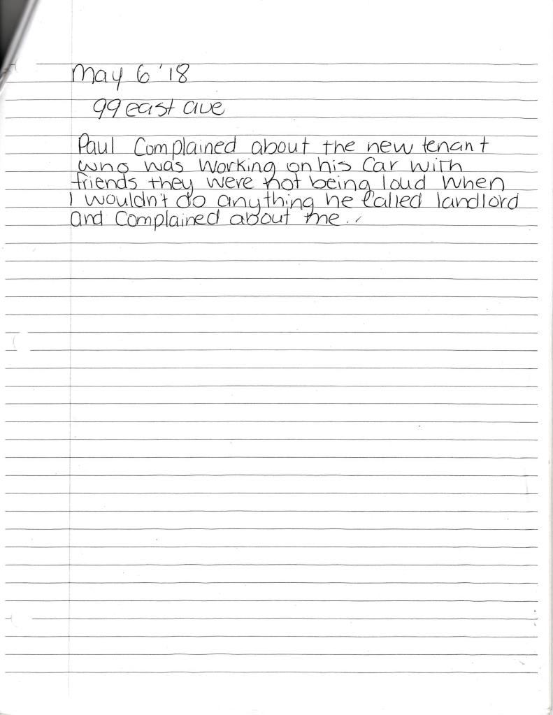Monday May 14, 2018 – I called Agostino to express my concerns (AR 111), and to tell him that if Richard accompanied him to the door to collect rent, we would not open the door. Agostino resisted the idea of using another witness than Richard.