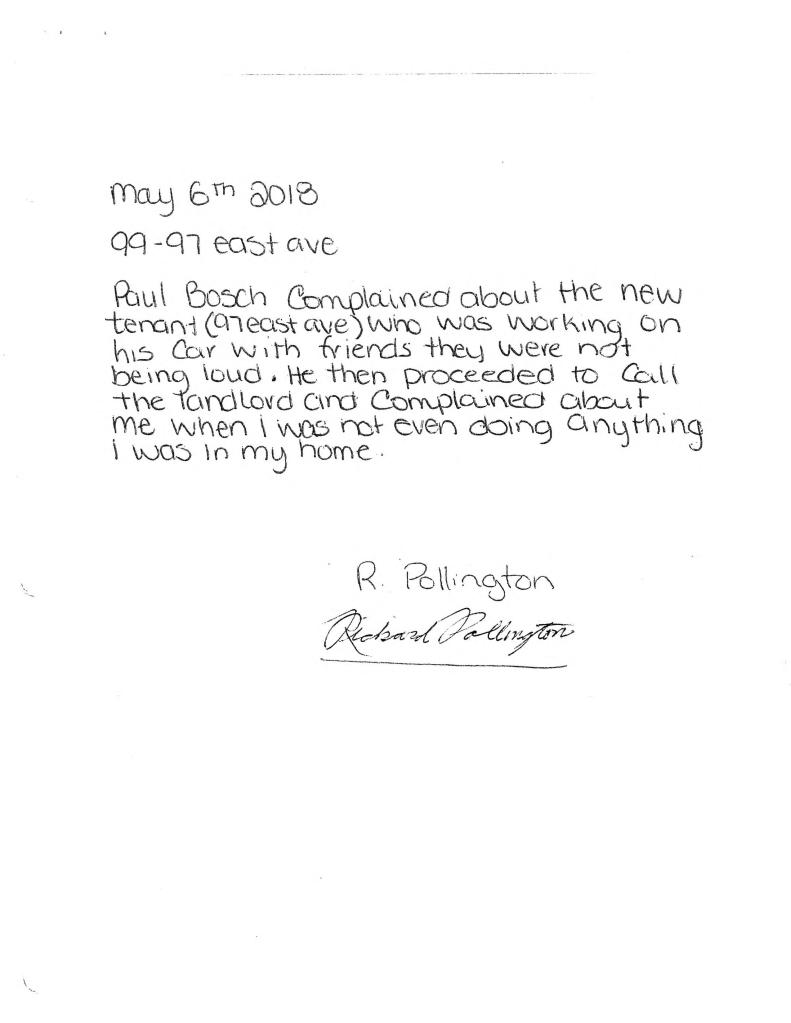 On Sunday, April 29, 2018, Mr. Bosch was unloading several boxes from a vehicle parked at the side of the building, Mr. Pollington pulled up in his vehicle, got out and began screaming at Mr. Bosch, threatening to call police for parking at the side of the building. The driveway at the side of the building is a common area, available to all tenants. When Mr. Pollington was informed of this, he continued screaming and creating a scene. There have been other incidents in the last few weeks where Mr. Pollington has created a disruption, and numerous instances where Mr. Pollington’s guests have created a disturbance.