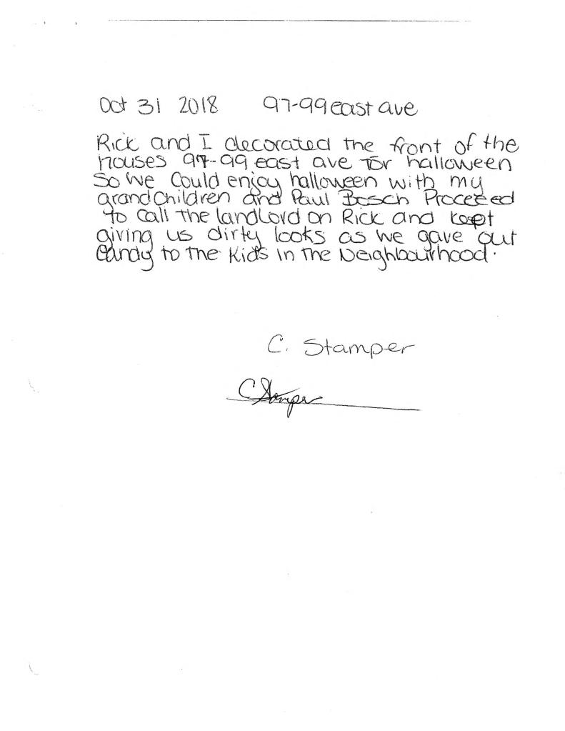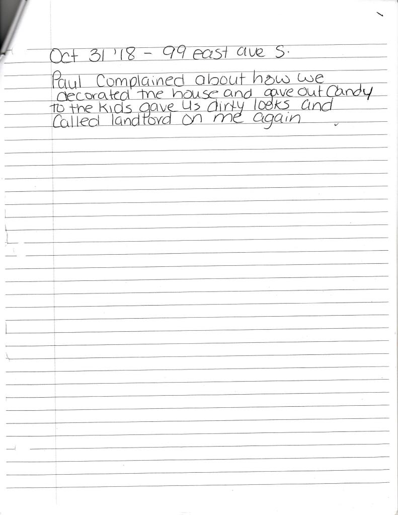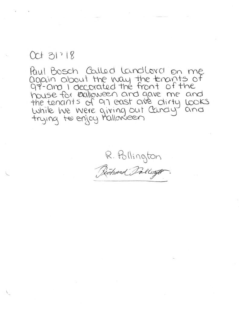 Wednesday October 31, 2018 – I spent the day away from East Ave S, and returned about 9:30 pm. I do not recall any interaction with Richard Pollington or Christina Stamper on that day.