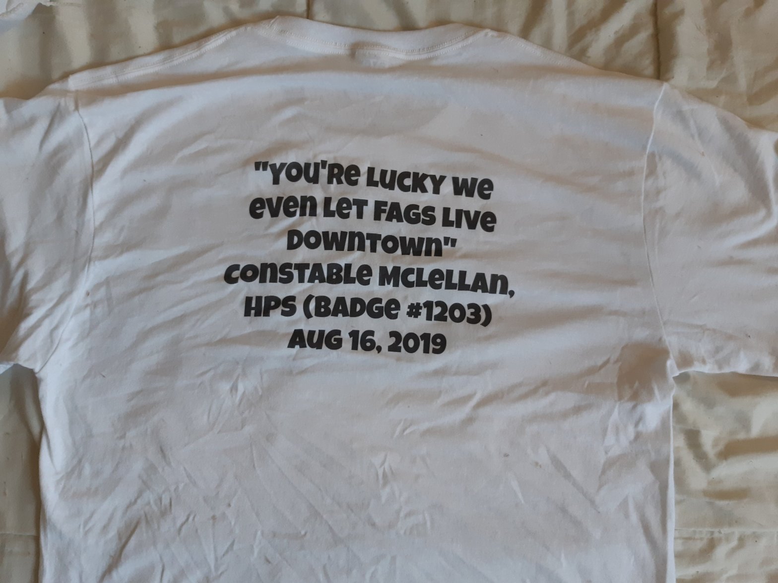 McClellan was also clearly becoming frustrated that Marie and myself hadn’t “just moved out”. He made reference several times to the waste of HPS resources (although he phrased it more diplomatically than that). He became increasingly condescending and dismissive. At one pint he said; “You know what the problem was? You’re the kind that talks back. If you hadn’t talked back to your landlord and to the superintendent this wouldn’t have happened. And it’s high school bullshit. Do you really care if they call you names? Stop calling us.” I replied that I found being called a “fag” in particular. I added that I didn’t expect anyone wearing “that disgrace of a cap badge” to understand the concept of defending one’s home. That led to a short and mutually insulting discussion on the recent events at Pride 2019 (and the rather tone deaf and downright insulting fallout from the City and HPS after that fiasco), and HPS treatment of mentally ill people in general (which, if I were being charitable, I would characterize as “Shitful”). McClellan didn’t like what I had to say (and after 20 minutes of his increasing antagonism, false analogies, downright stubborn ignorance of the rental market in Hamilton and outright victim blaming, I pushed back. Verbally. I have a sharp tongue sometimes. This was one of those times.